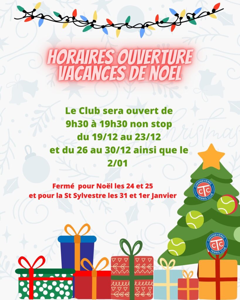 Le club sera ouvert de 9h30 à 19h30 non-stop du 19/12 au 23/12 et du 26/12 au 30/12 ainsi que le 2/01. Fermé pour Noël